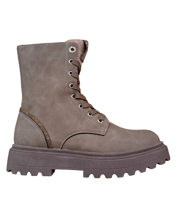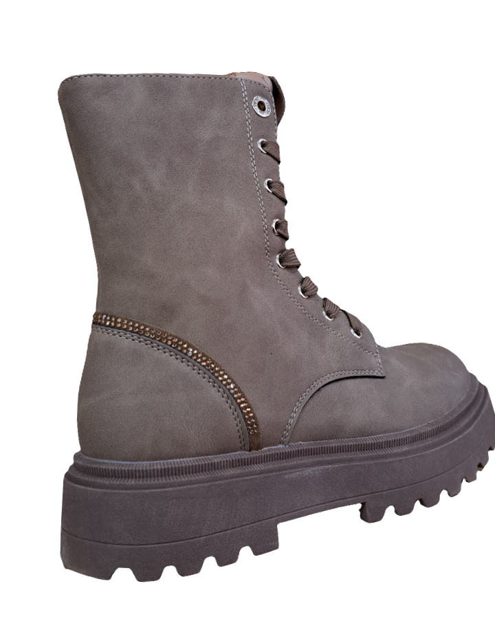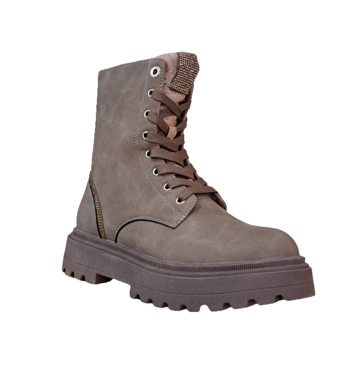 Anfibio in ecopelle e dettagli lucidi. Linguetta geo e dettagli striscia stras. Chiusura con lacci e zip laterale. Fondo gomma 4,5cm.