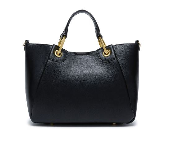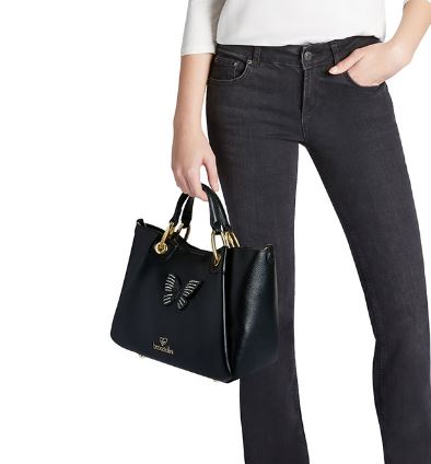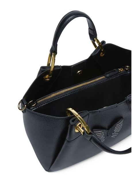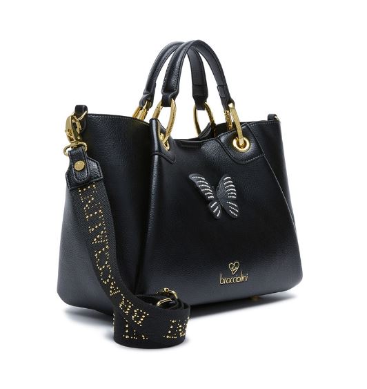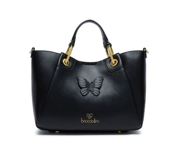 Borsa a mano in ecopelle, con applicazione farfalla e strass. Doppio manico e tracolla in tessuto logato con ganci metallici oro. Scomparto interno zip.
