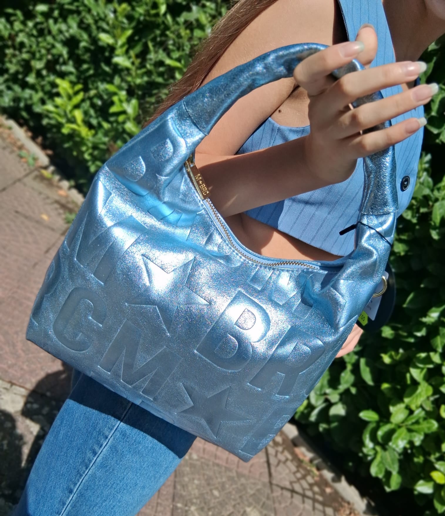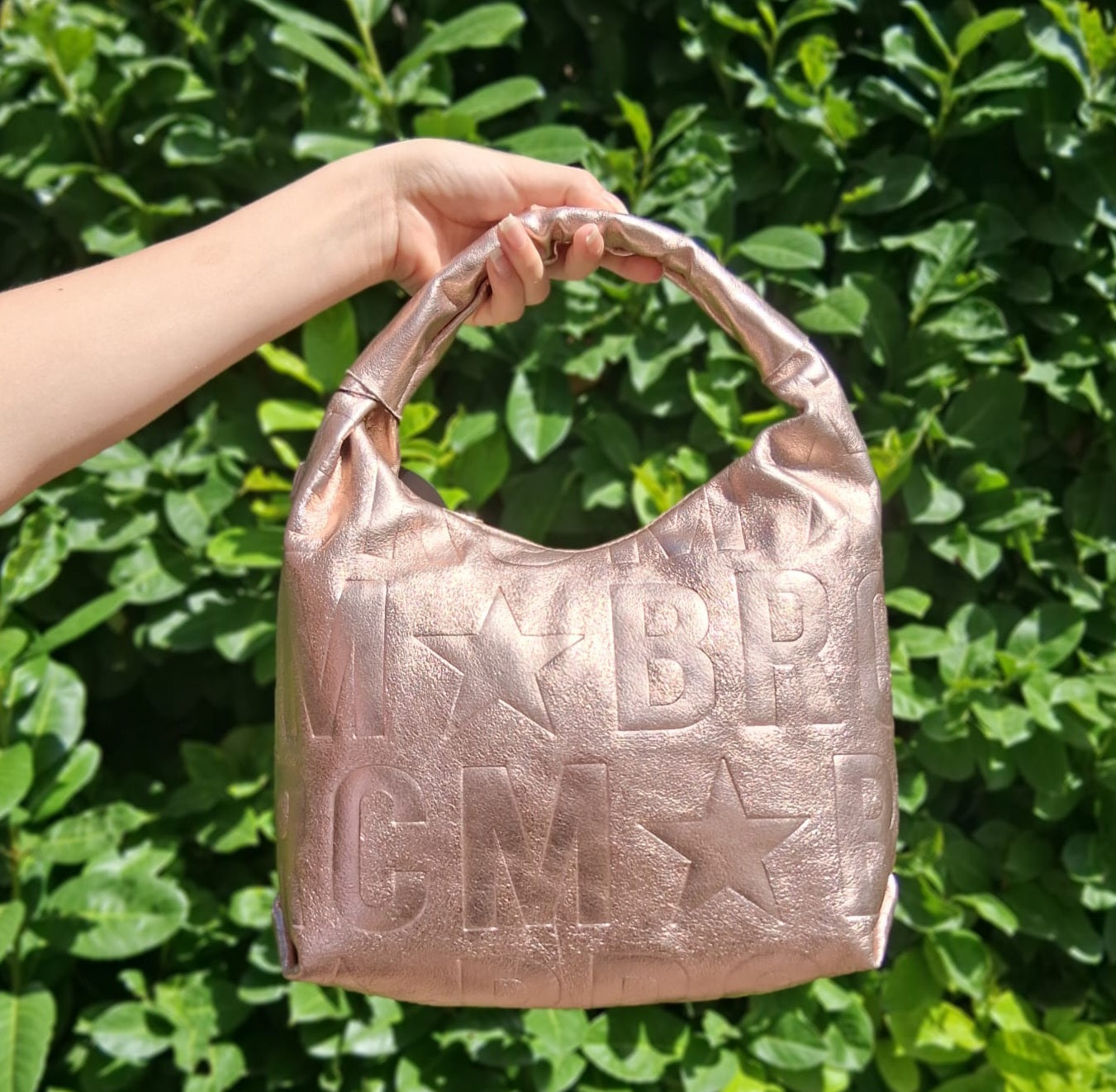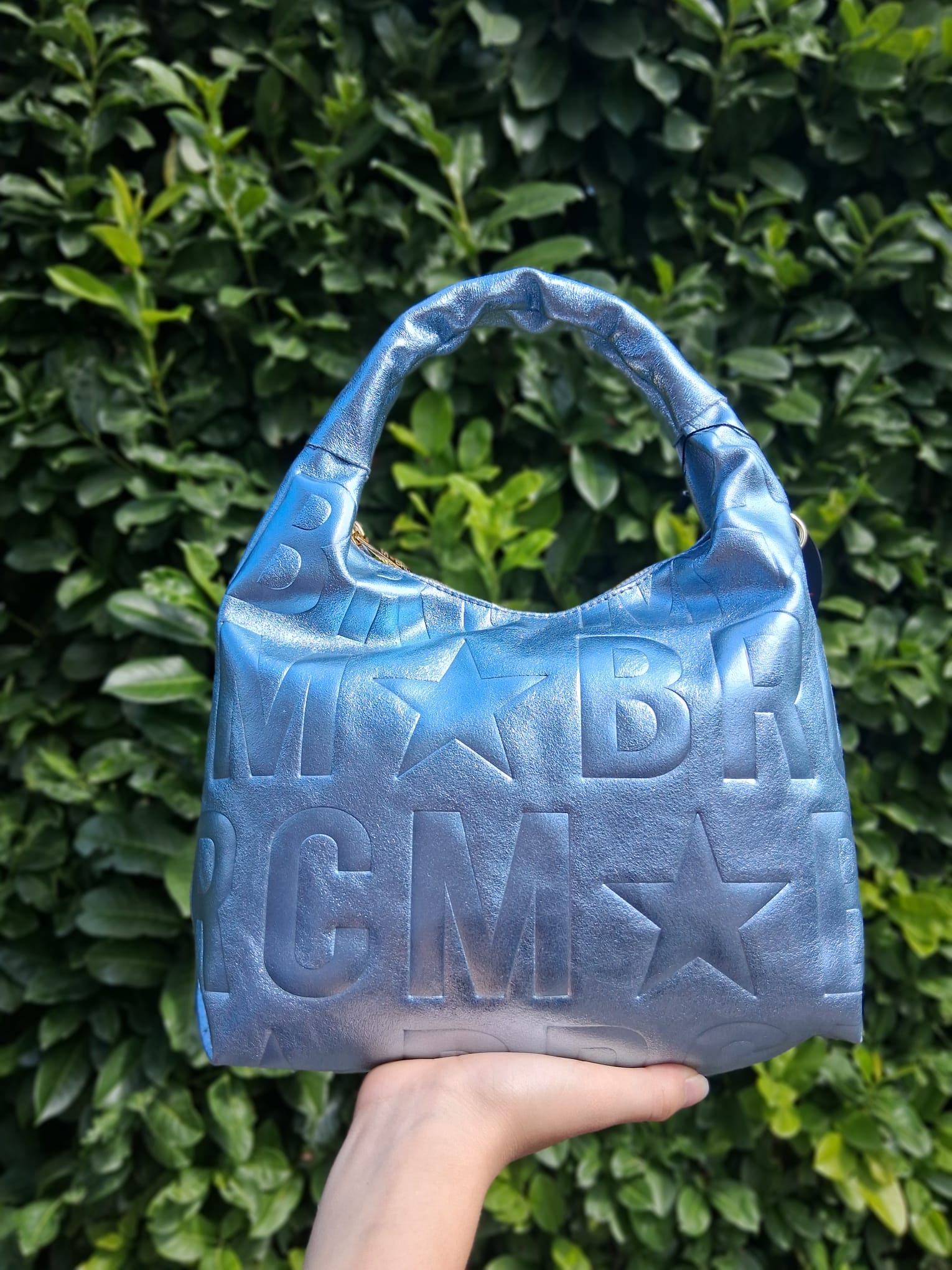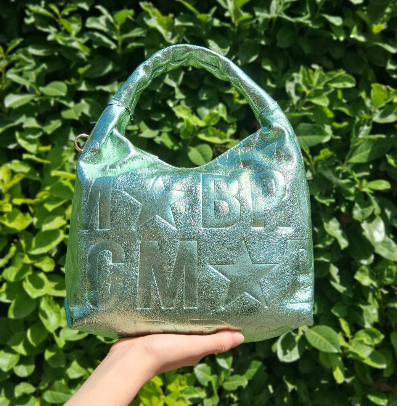 Borse a spalla in vera pelle morbida laminata. Logo all over. Manico in pelle. Chiusura con zip. Tracolla regolabile. Rivestita internamente in tessuto.