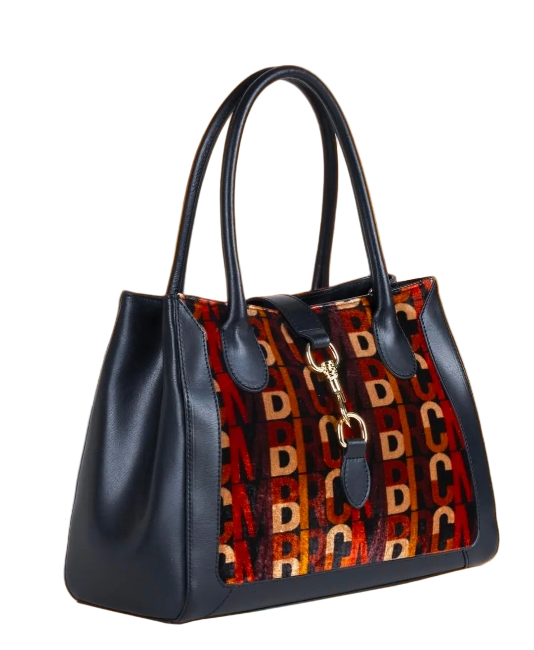 Borse a spalla in pelle con stampa su velvet logata. Chiusura con zip e striscia pelle con gancio metallico. Doppio manico in pelle. Tracolla pelle regolabile.