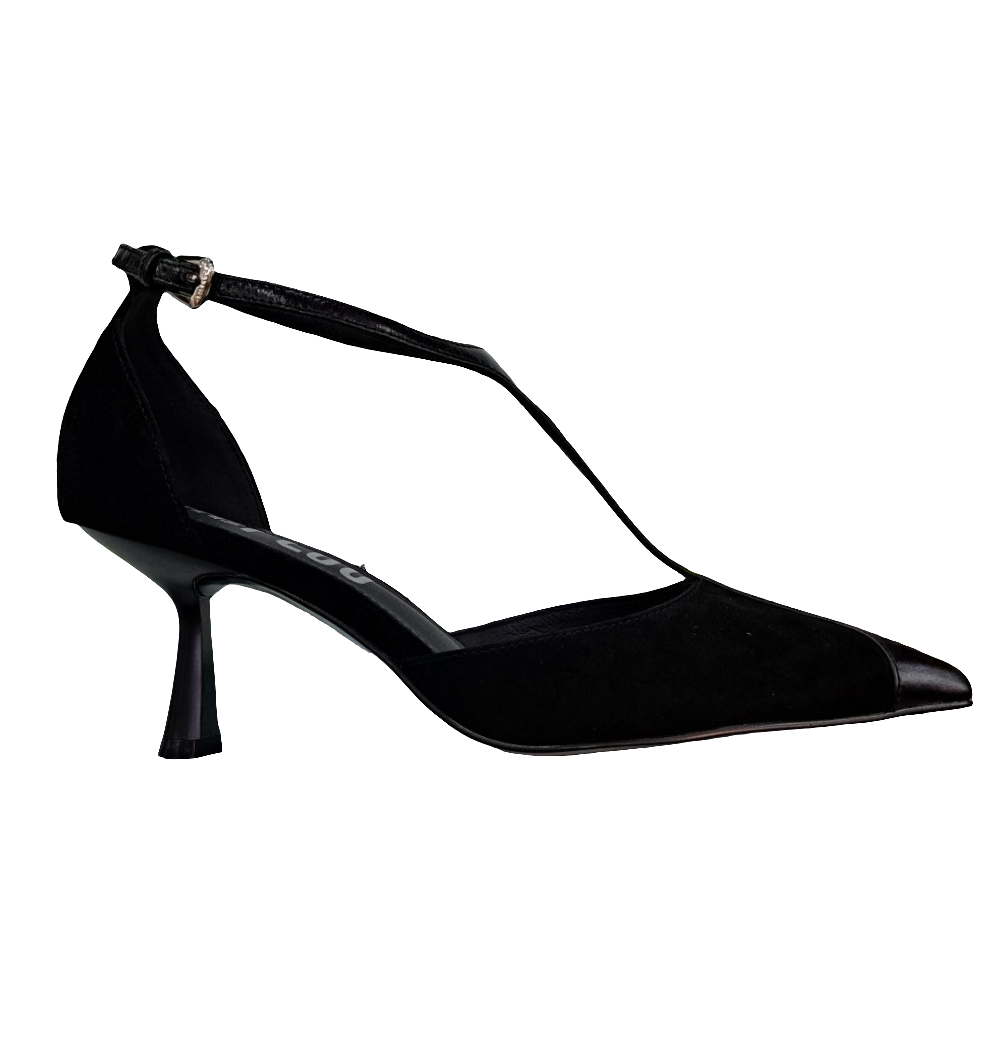 Decolleté in pelle e pelle scamosciata. Soletta in pelle. Cinturino alla caviglia regolabile. Tacco 4cm