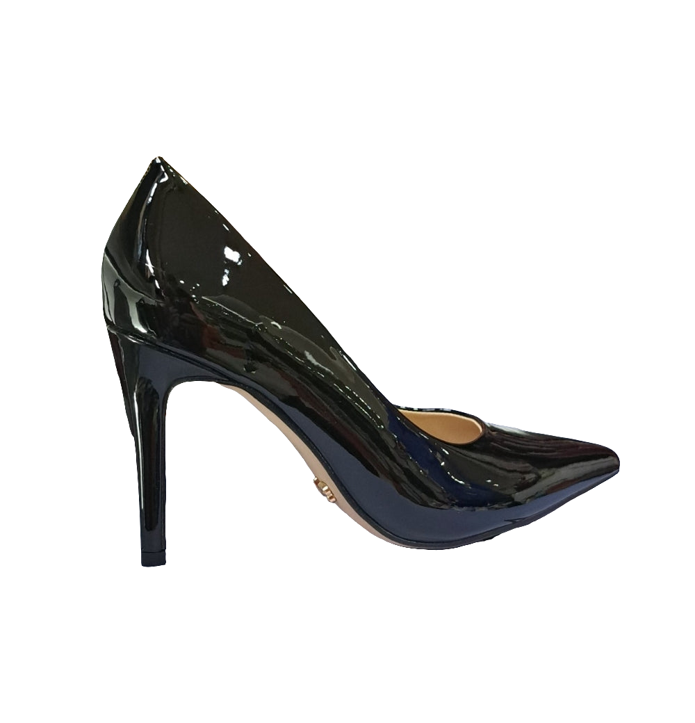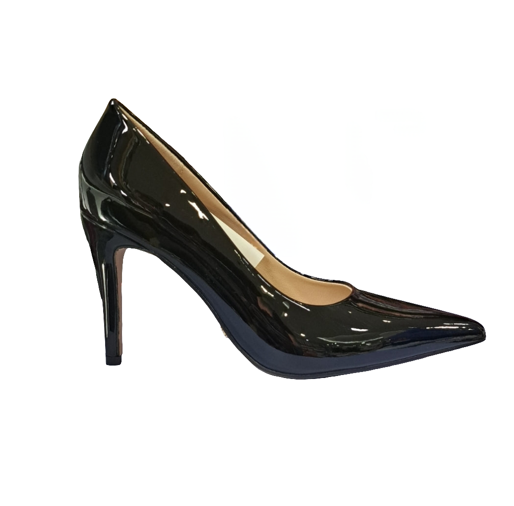 Decolleté in ecopelle vernice, soletta in pelle. Punta affusolata. Tacco spillo 9,5cm