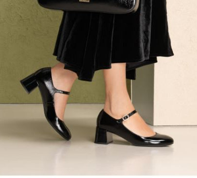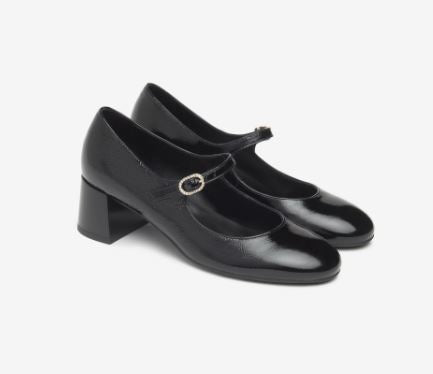 Decolleté in pelle vernice rivestita internamente in pelle. Soletta in pelle. Modello Mary Jane con chiusura regolabile. Tacco squadrato 5 cm.
