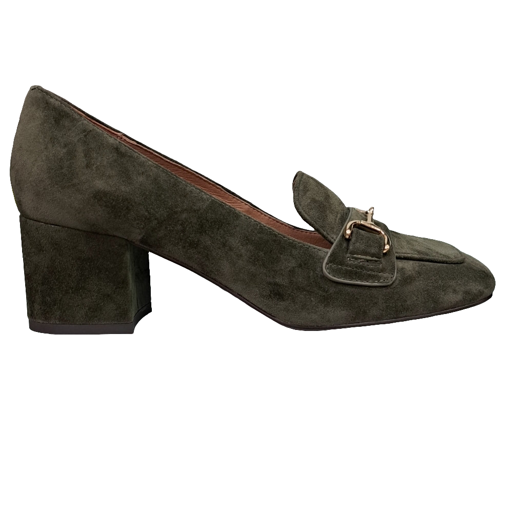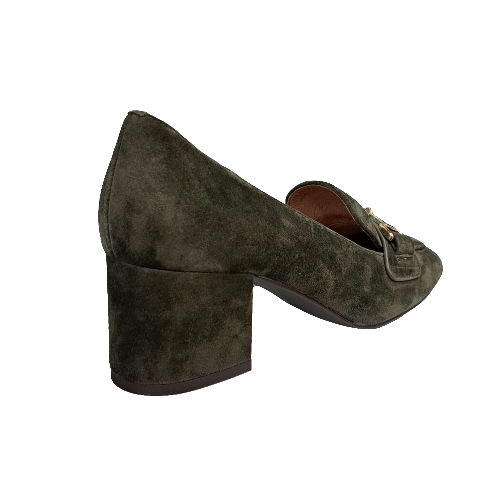 Mocassino in vera pelle scamosciata morbido. Rivestito internamente in pelle. Applicazione metallica gold. Punta squadrata. Tacco squadrato 6cm.