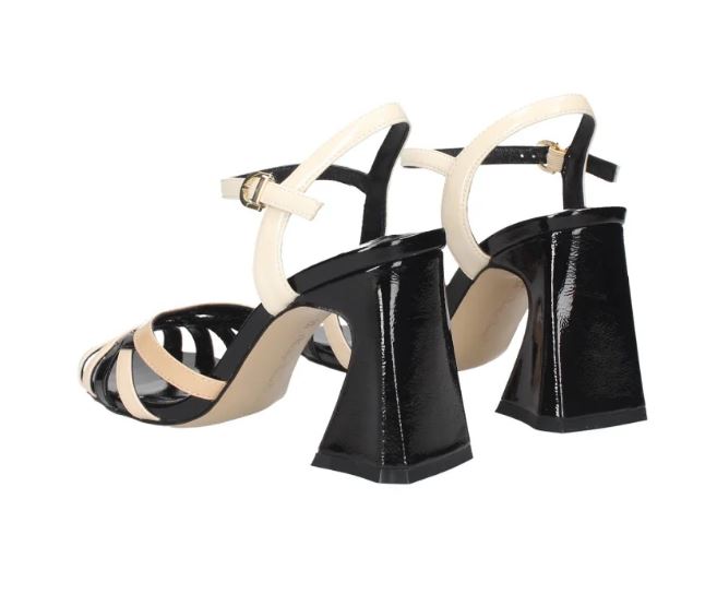 Sandalo realizzato in vernice con fasce beige, bianco e nero. Cinturino alla caviglia regolabile. Tacco squadrato 10cm