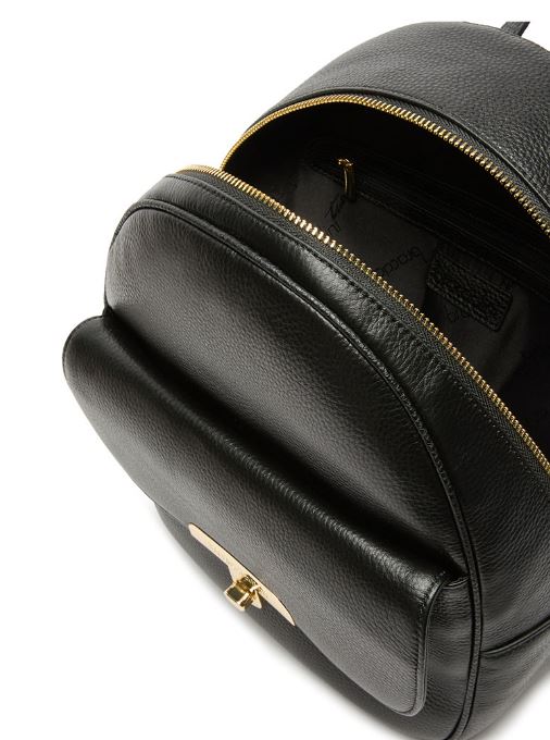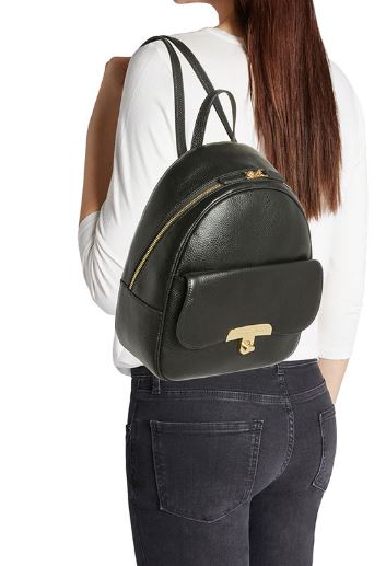 Zaino in ecopelle con tasca frontale con chiusura clip metallica. Rivestito internamente con tessuto logato. Chiusura zip. Spallacci regolabili.