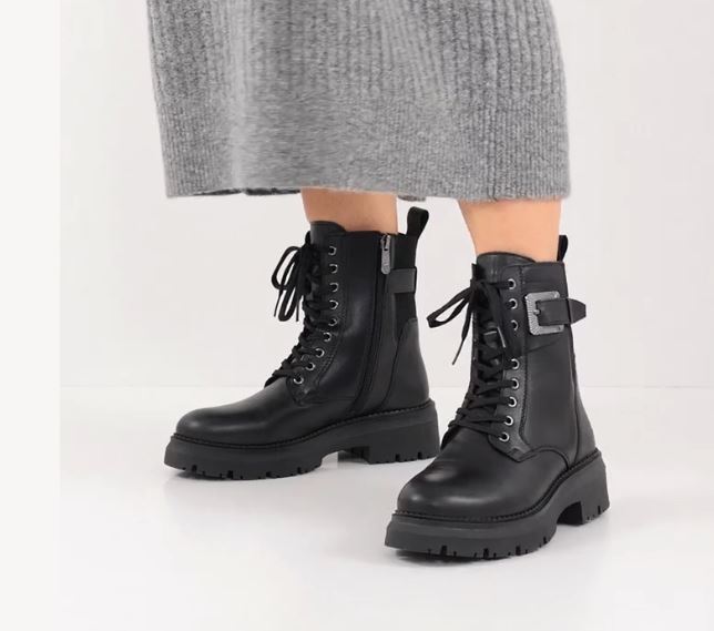 Anfibi in pelle con elastico posteriore e fibbia decorativa. Plantare caldo tessuto comfort. Rivestito internamente in caldo tessuto. Chiusura con lacci e zip laterale. Fondo gomma 5cm.
