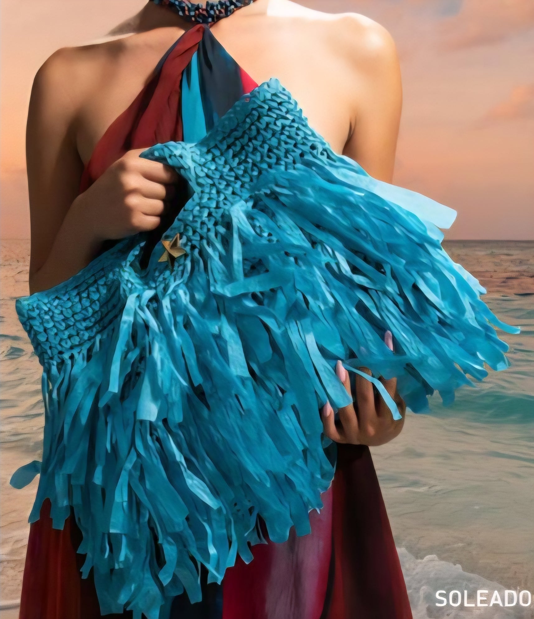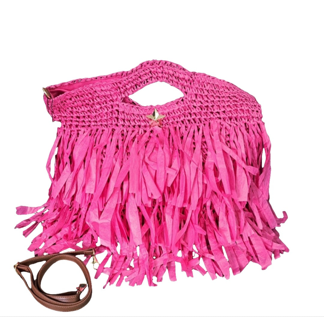 Borsa are in tessuto intrecciato e frange. Rivestita internamente in tessuto. Tasca portaoggetti. Chiusura clip. Tracolla in pelle cuoio regolabile.
