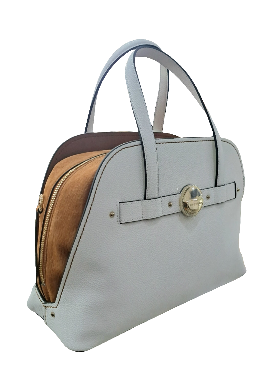 Borsa in vera pelle con parte interna in vero camoscio nocciola. Parte interna staccabile dalla parte esterna in pelle bianca, si trasforma in borsa in camoscio con tracolla in tessuto regolabile. Doppi manici in pelle bianca. Logo frontale. Chiusura con zip.