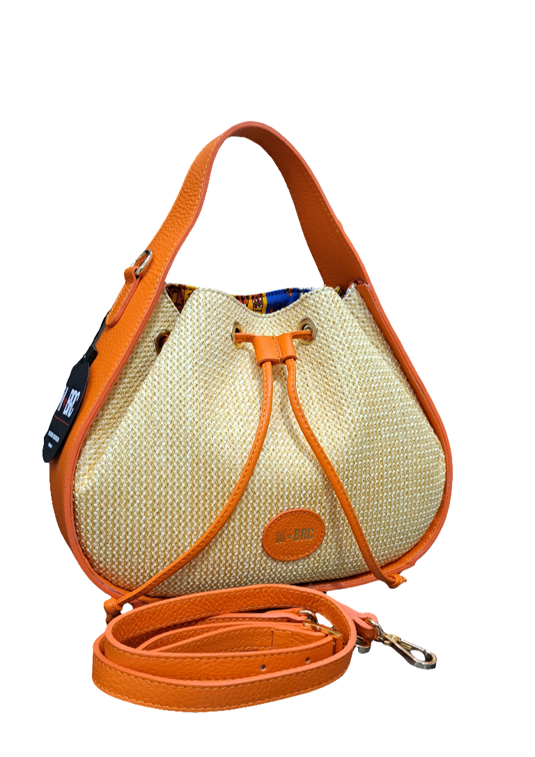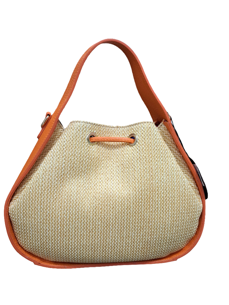 Borsa in rafia intrecciata e dettagli pelle arancio. Chiusura con lacci. Tasca interna portaoggetti. Rivestita internamente. Manico in pelle. Tracolla regolabile in pelle.