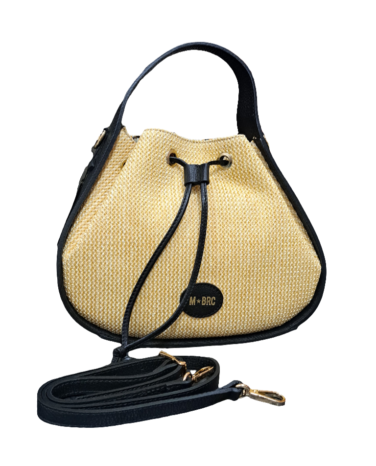 Borsa in rafia intrecciata e dettagli pelle nera. Chiusura con lacci. Tasca interna portaoggetti. Rivestita internamente. Manico in pelle. Tracolla regolabile in pelle.
