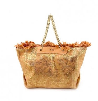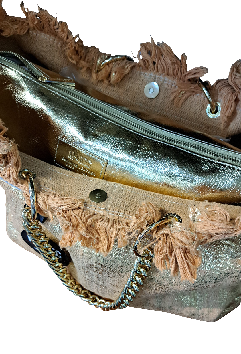 Borsa in tessuto con mash arancio. manici catena gold. Borsa interna con zip colore gold. Chiusura borsa con clip. Logo stampato frontale.