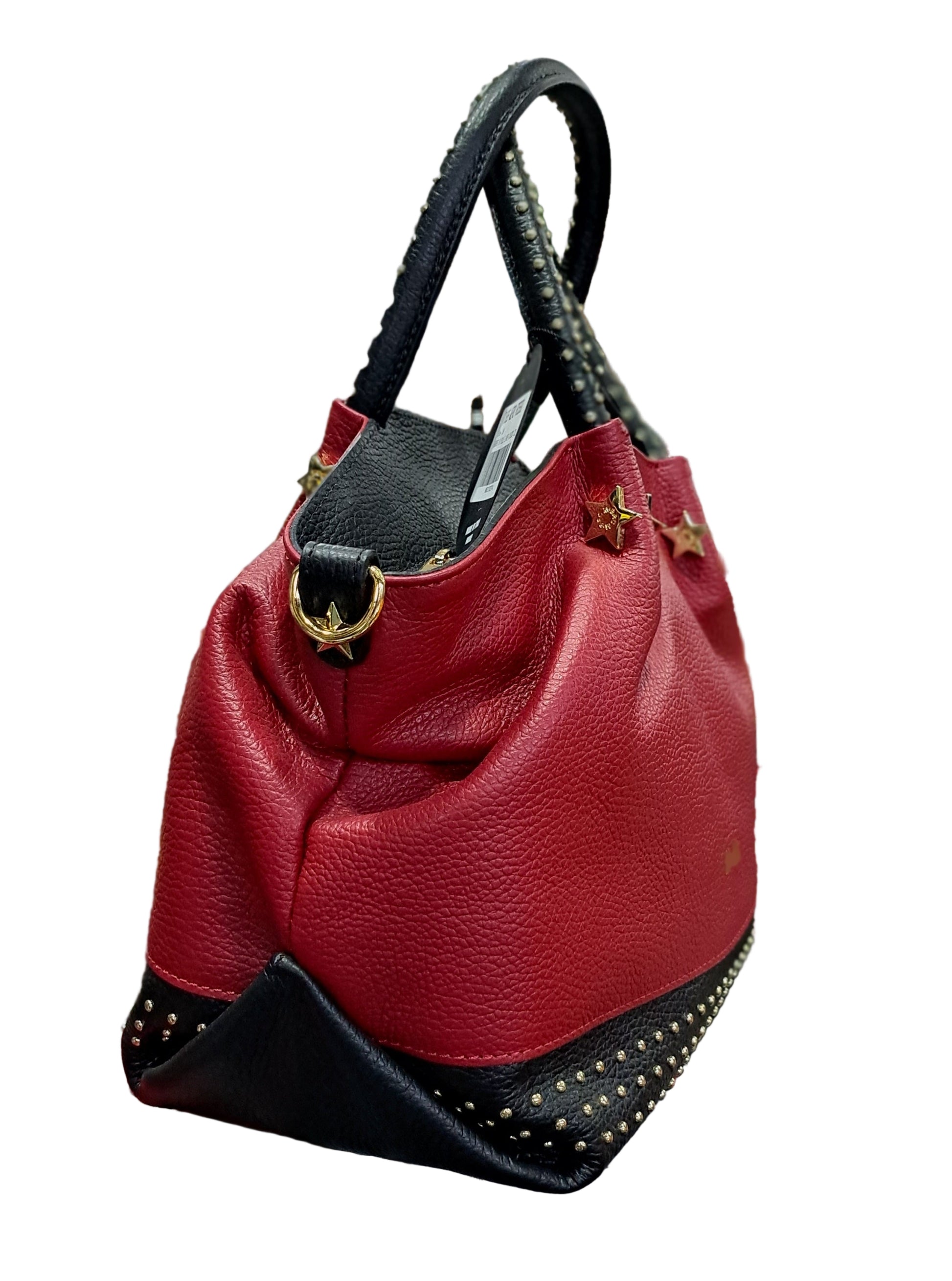 Borsa in vera pelle morbida, rivestita internamente. Tasca portaoggetti.. Chiusura con zip. Tracolla in pelle regolabile e manico decorato con mini borchie oro. Metalleria oro.