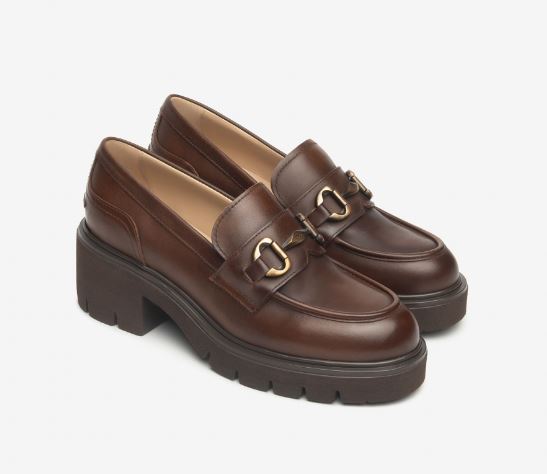 Mocassini in pelle, rivestito internamente in pelle. Fibbia decorativa metallo silver. Soletta in pelle. Fondo gomma 6cm.