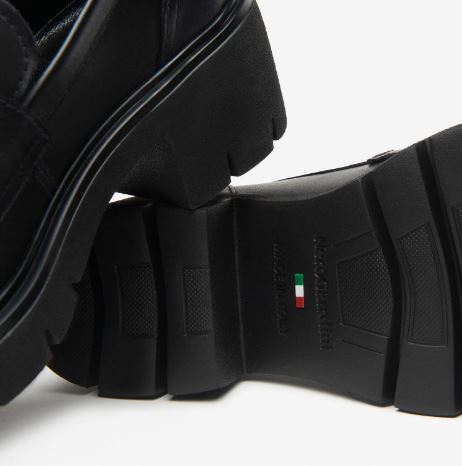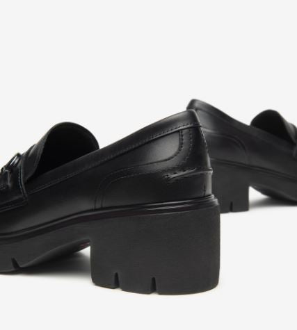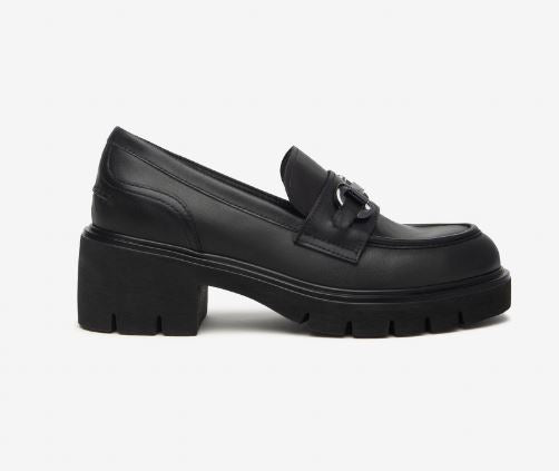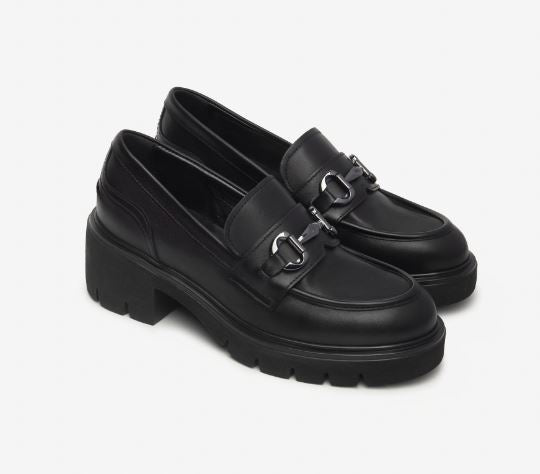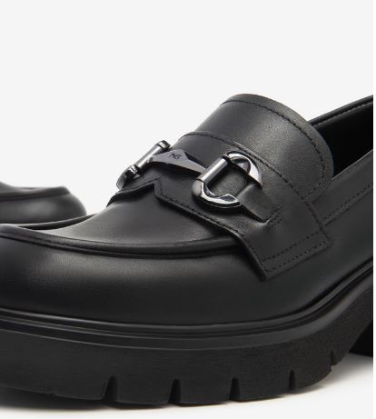 Mocassini in pelle, rivestito internamente in pelle. Fibbia decorativa metallo silver. Soletta in pelle. Fondo gomma 6cm.