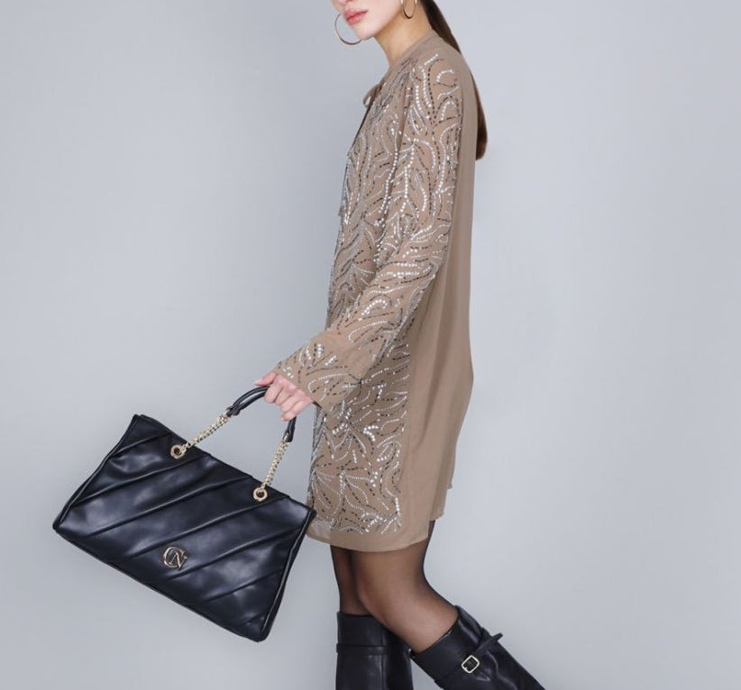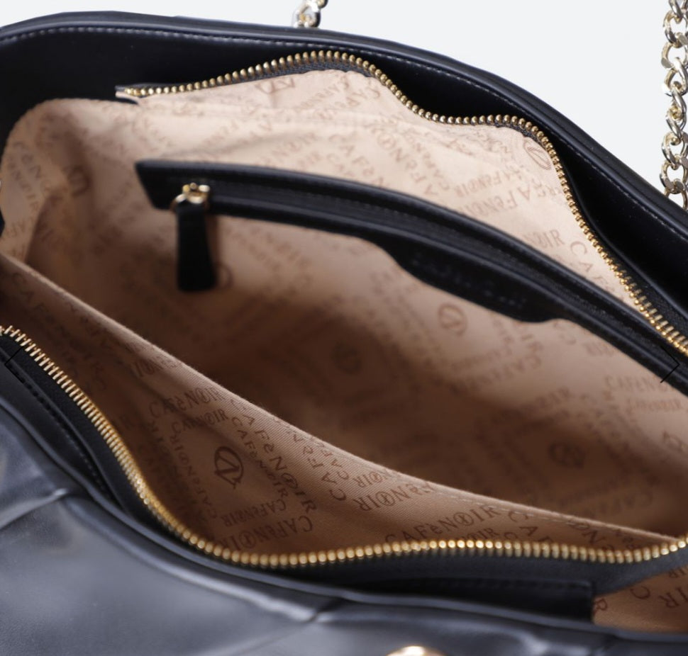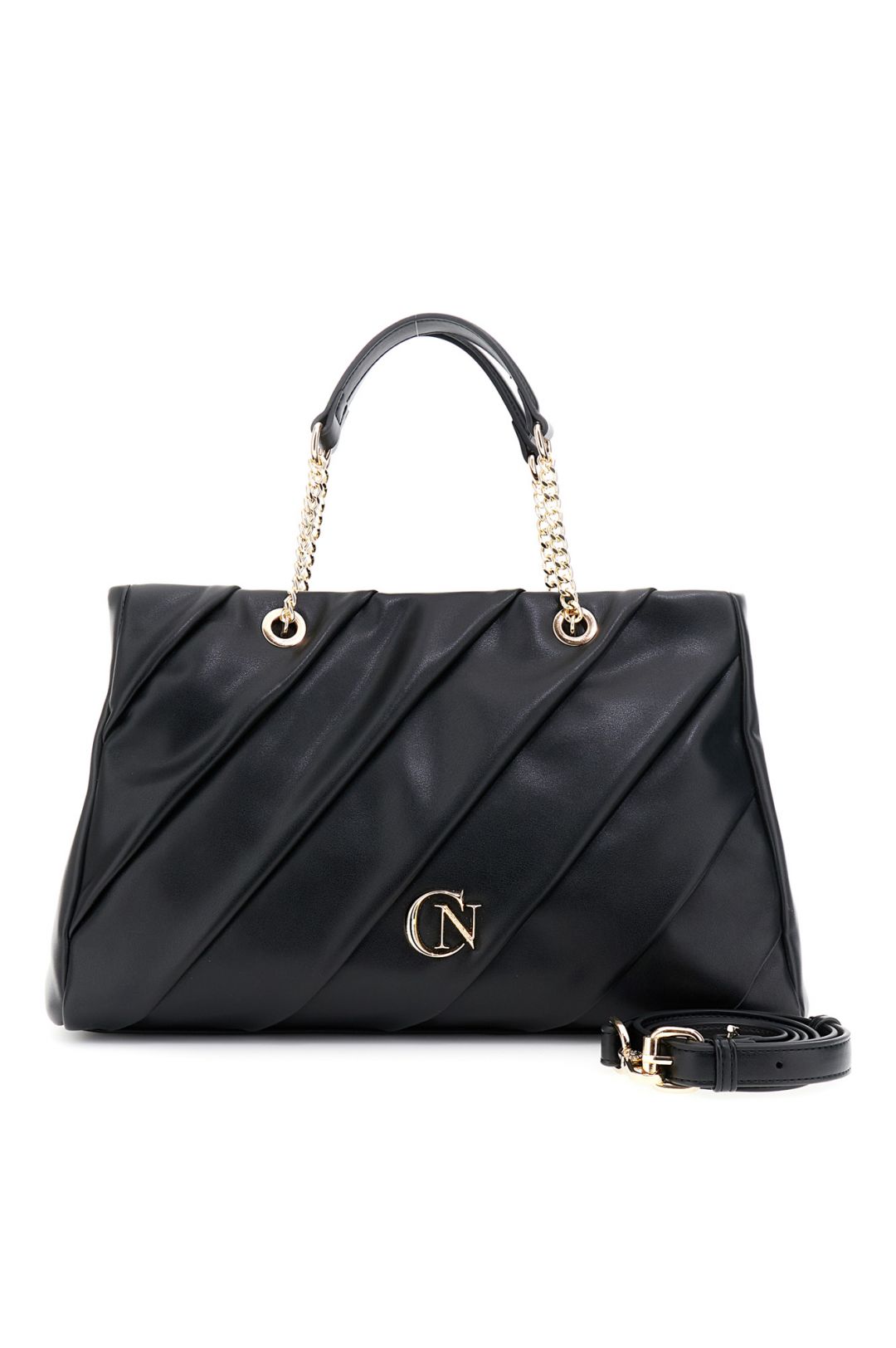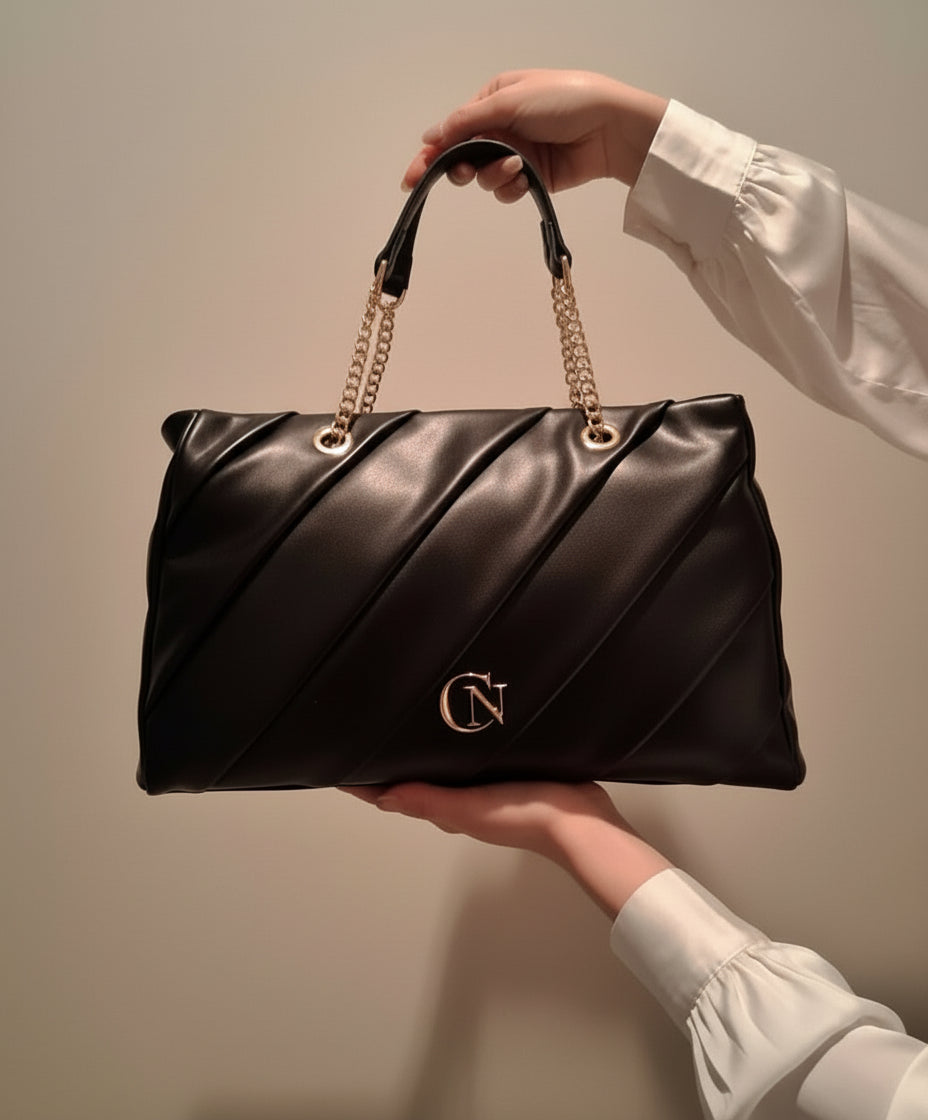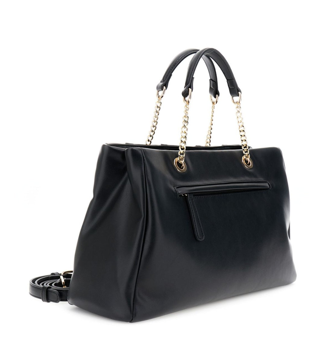 Borsa in ecopelle effetto plissettato. Rivestita internamente in tessuto logato. Tasca interna zip. Doppio manici catena gold ed ecopelle. Tracolla ecopelle regolabile