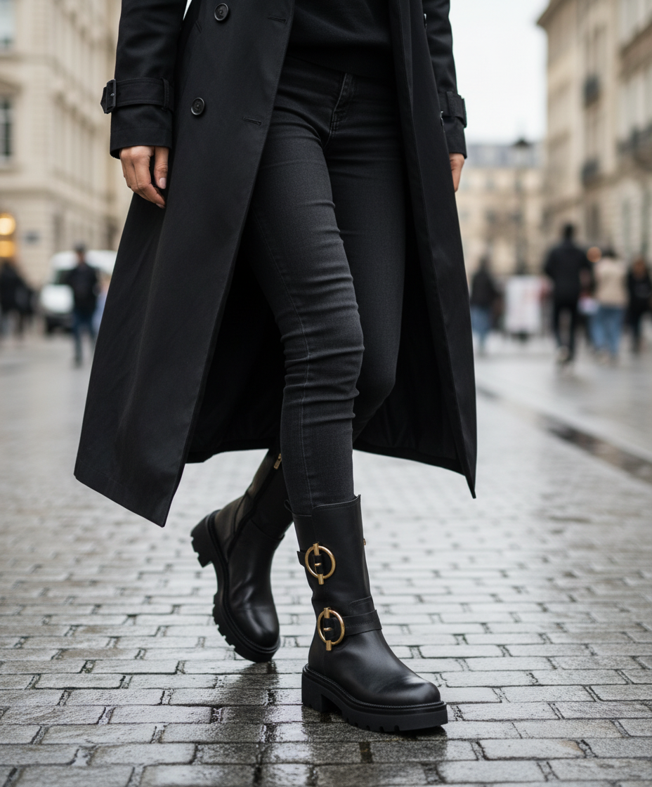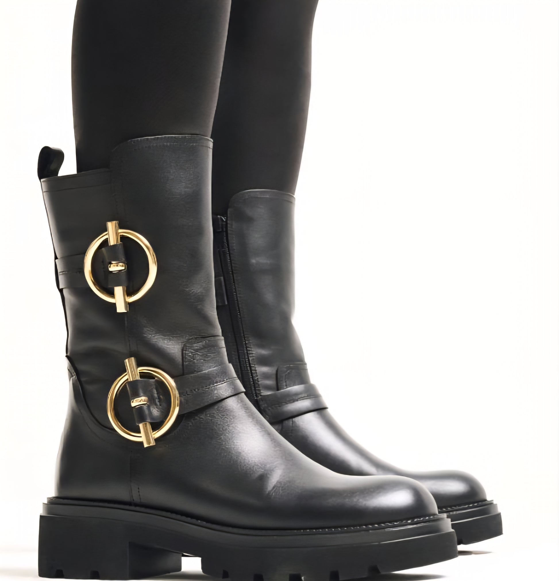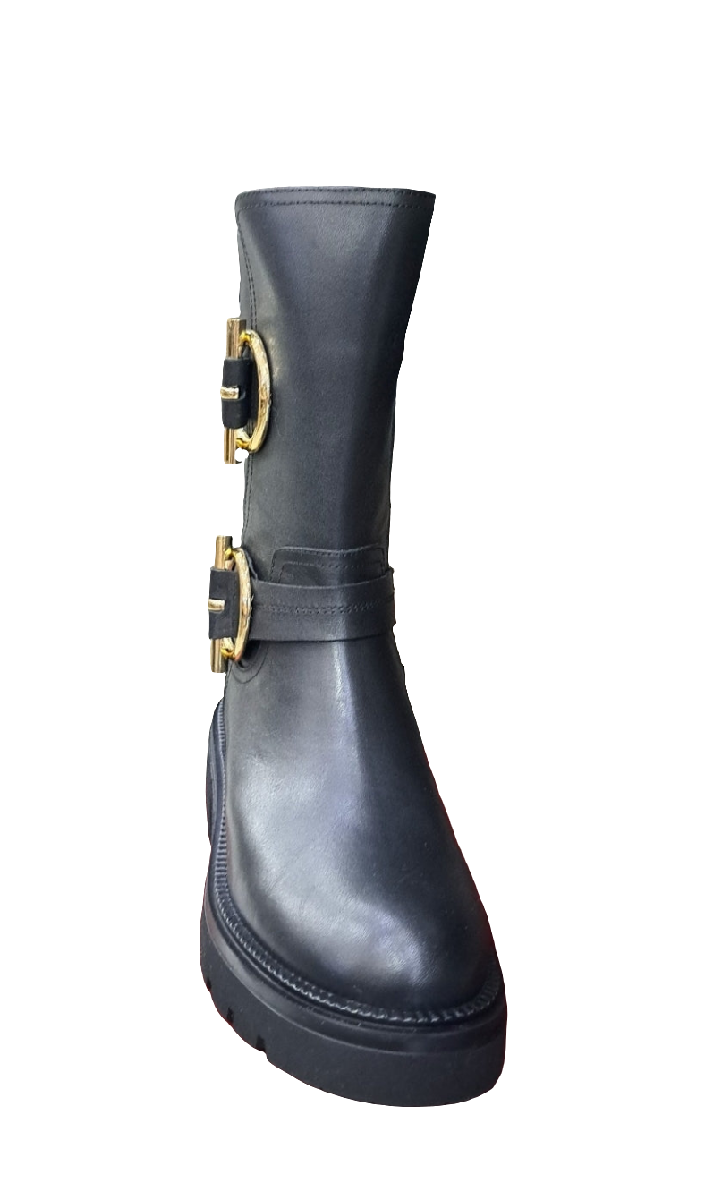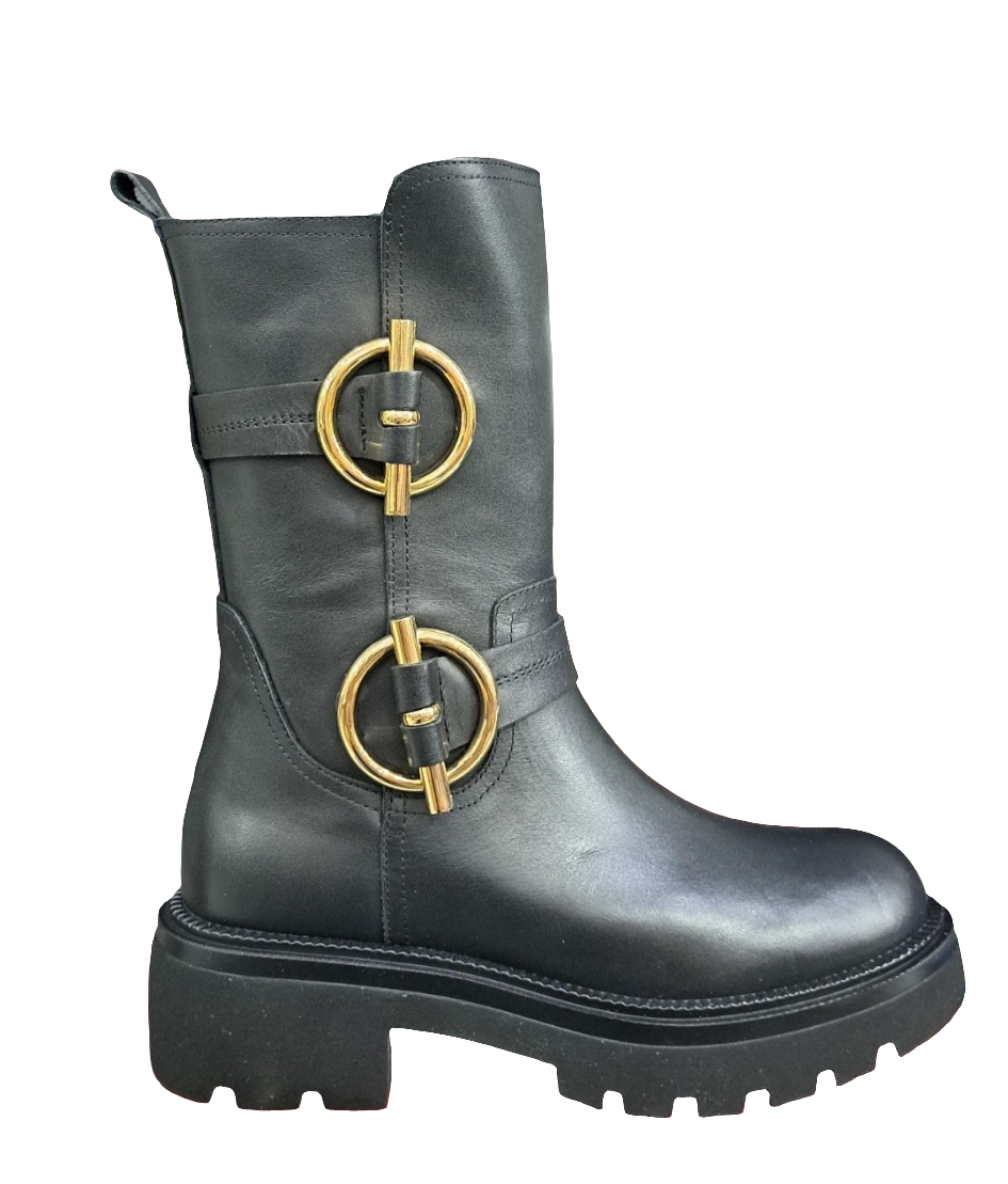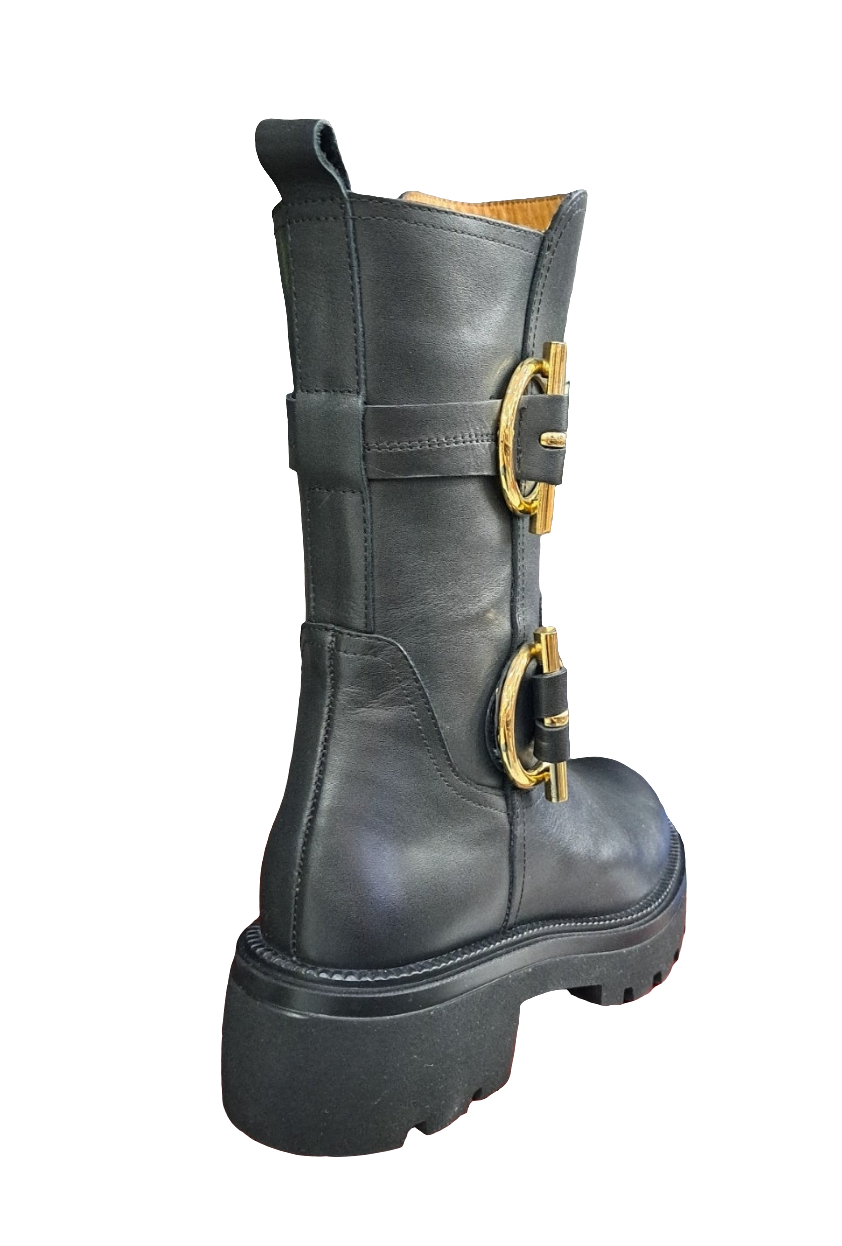Stivali in vera pelle. Decorazione metallica oro. Chiusura con zip laterale. Fondo gomma 5cm.