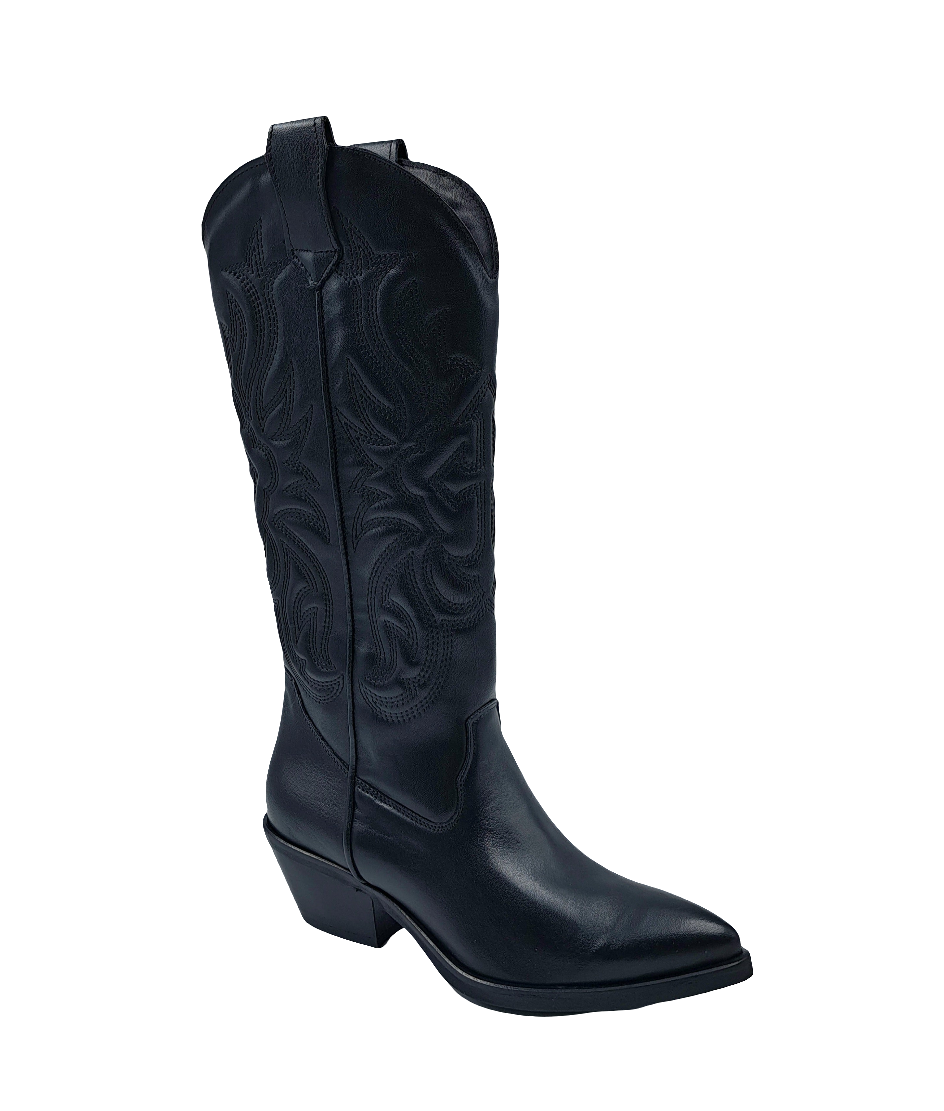 Stivale modello Texan in vera pelle, decorazioni ricamate. Rivestito internamente in pelle e tessuto Tacco 5cm, gambale 33/35cm.