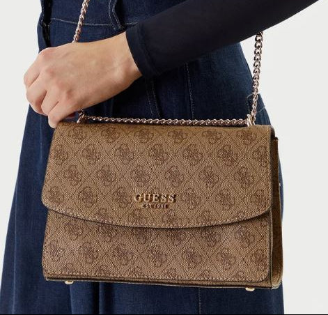 Borsa a spalla in ecopelle stampa logo all over. Rivestita internamente in tessuto logato. Tasca con zip. Chiusura con patta e clip. Tracolla ecopelle e catena metallo.