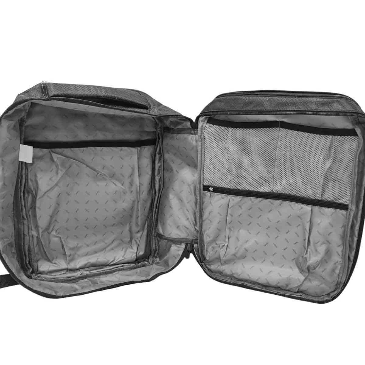 Zaino mini bagaglio a mano approvato Ryanair misure 40x20x25. Rivestito internamente con tasche interne. Tasca frontale porta PC. Tracolle imbottite regolabili. Elastico schienale per alloggiamento trolley. Zip posteriore per ampliare volume.
